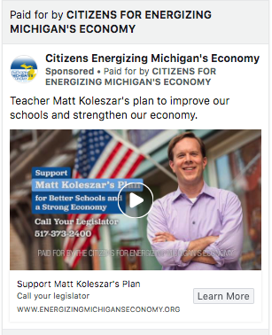 ACRONYM’s LEDGE program is also the largest investor in Michigan state legislative elections, as we’re running digital programs to help progressives make gains in both chambers this cycle. Interestingly, another one of the top spenders is Citizens for Energizing Michigan’s Economy, a group running ads in support of candidates on both sides of the aisle running for Michigan House in different districts. Take a look: