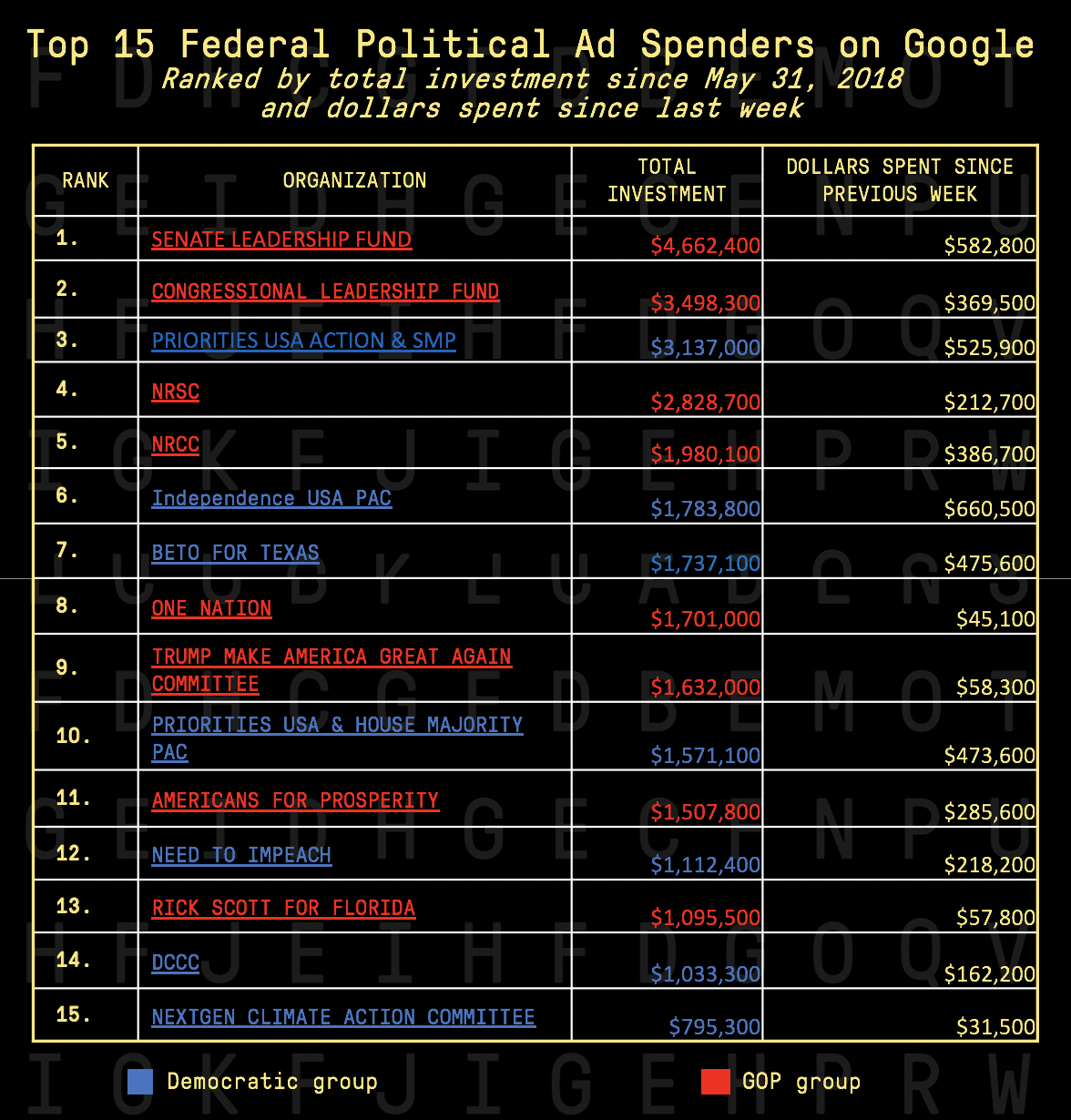 On Facebook, however, this week’s top spender was Texas’ Beto O’Rourke, who spent $938,858 from October 21-28 - on Facebook alone.