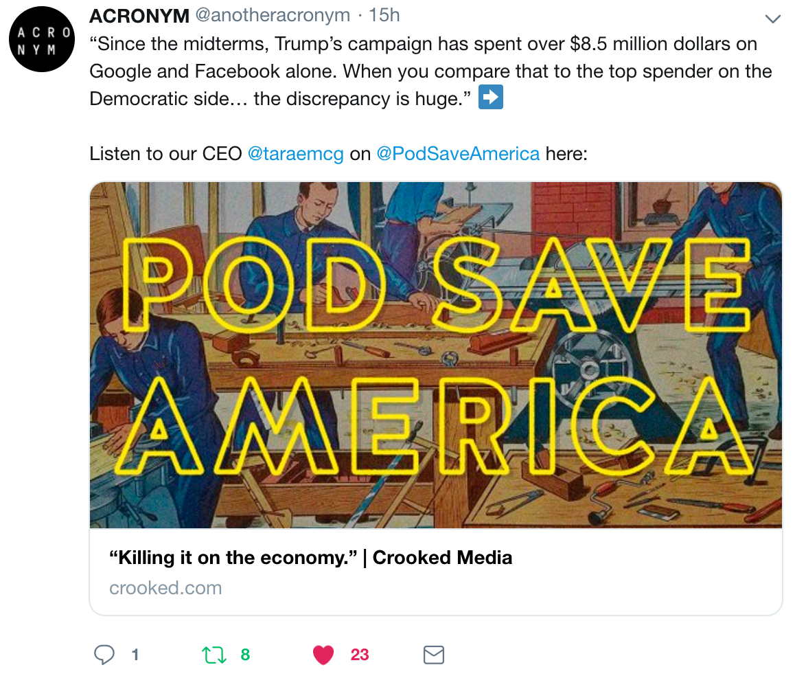 On Monday, ACRONYM’s Founder and CEO Tara McGowan was featured on Pod Save America to speak with Tommy Vietor about the 2020 campaign, FWIW, and what Democrats need to do to beat Trump. Listen to the interview here (it begins at the 51:00 minute mark).