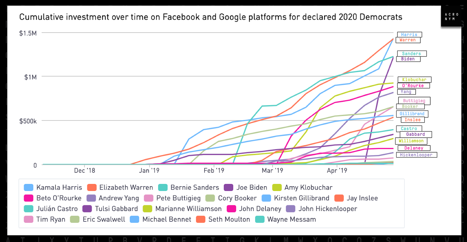 Joe Biden continued his significant investment in Facebook and Google last week, once again leading the Democratic field in overall digital spending. Meanwhile, Kamala Harris’ nearly quadrupled her spending on the platforms, mostly on Facebook, running hundreds of ads smartly capitalizing on her performance grilling Attorney General Barr last week at a Senate Judiciary Committee hearing.