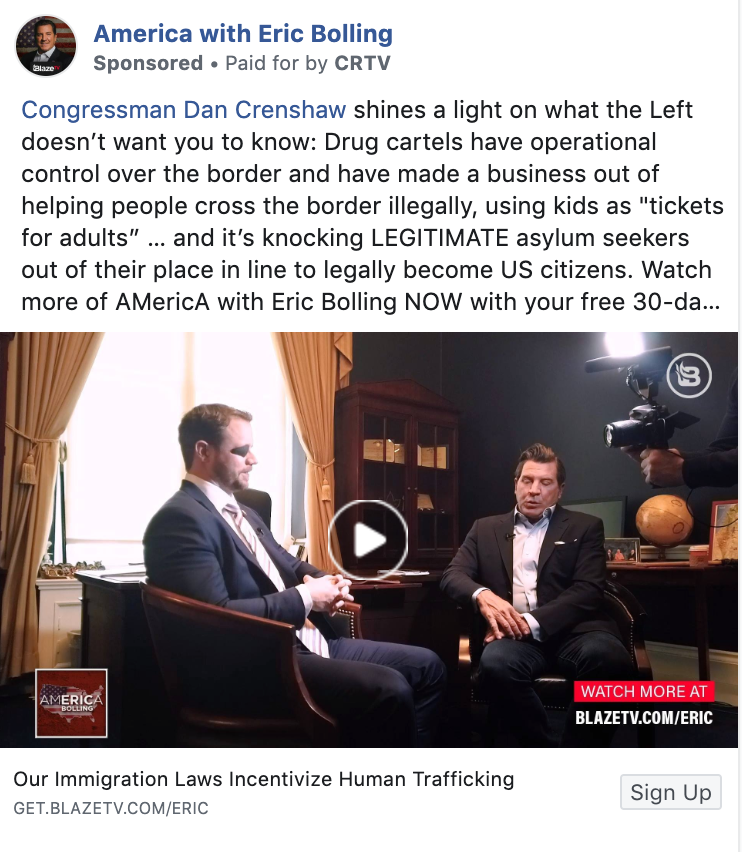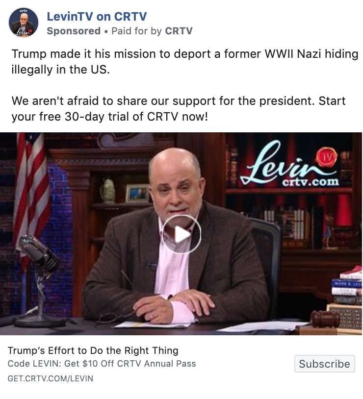 Blaze Media and CRTV, which runs a network of newsy-like conservative content properties on Facebook, is also a regular and consistent high dollar spender on the platform. Personalities like Eric Bolling, Mark Levin, and others use various pages to spend tens of thousands of dollars pushing original content featuring pro-Trump messaging: