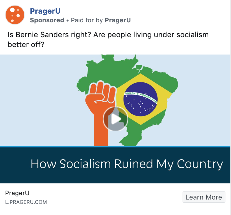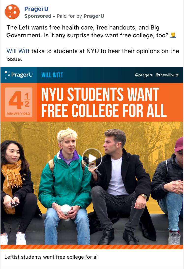 Prager University, or PragerU, is a far-right conservative digital content property masking as an educational institution, and registered as a nonprofit. Their speciality is churning out slick, 5-minute persuasion videos highlighting hardline conservative positions on nearly every political issue. PragerU has spent $1,734,983 on Facebook since Election Day. That’s a larger investment than any one of the 2020 Democratic candidates, the DNC, DCCC, DSCC, and almost every other progressive organization has made during the same time period online.