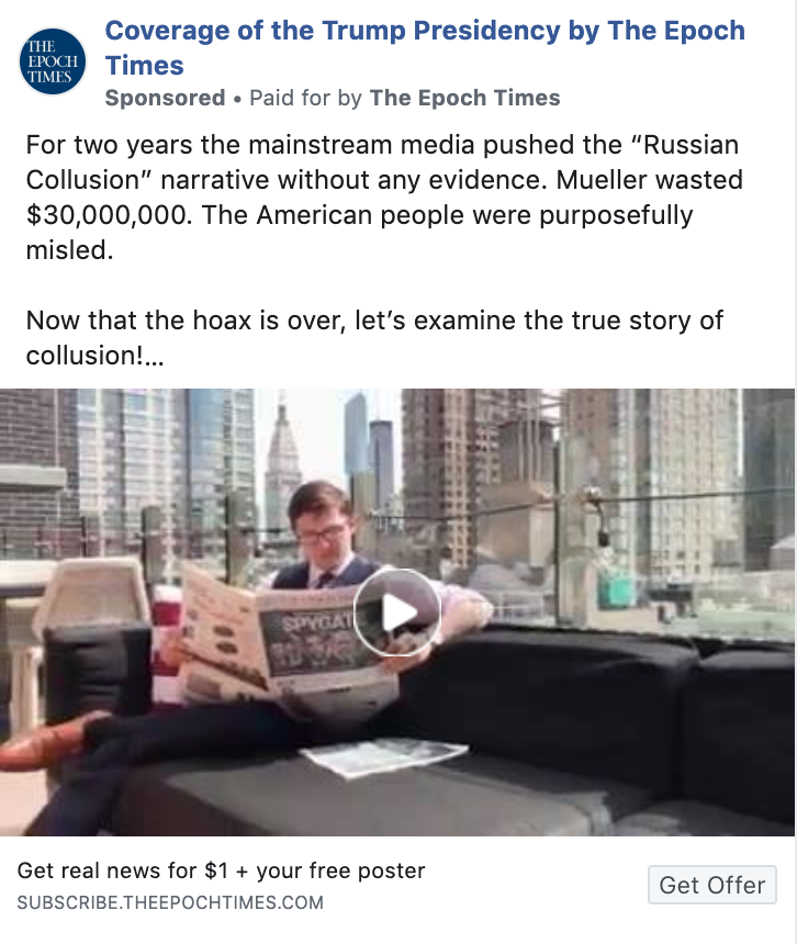 In last week’s edition of FWIW, we flagged that The Epoch Times was the number four political spender on Facebook, pushing hundreds of pro-Trump and anti-Biden ads. Cumulatively, it appears the Epoch Times has spent $543,544 on pro-Trump Facebook ads since Election Day - but only started their significant spending in February.
