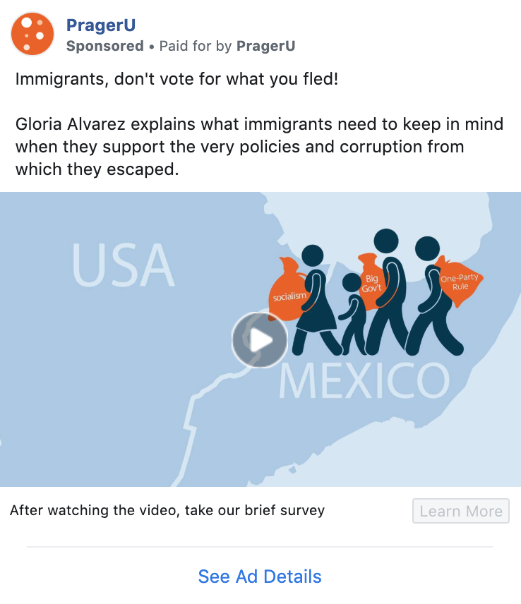 PragerU has consistently been among the top political spenders on Facebook for weeks and spent $72,070 on Facebook ads last week alone. Their video ads push out non-stop anti-immigrant, anti-worker, anti-environment, and anti-choice messaging. Here’s some of what they’re running: