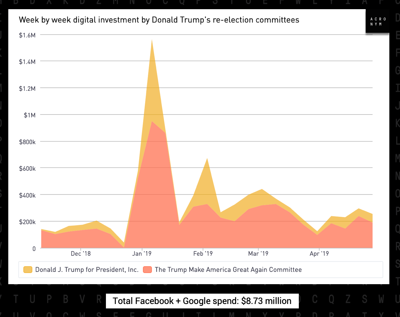Donald Trump’s campaign digital spending decreased slightly over the past week, and he’s now spent over $8.7 million on Google and Facebook cumulatively since the midterms. You can see all these charts and how they change over time at our FWIW Digital Dashboard.