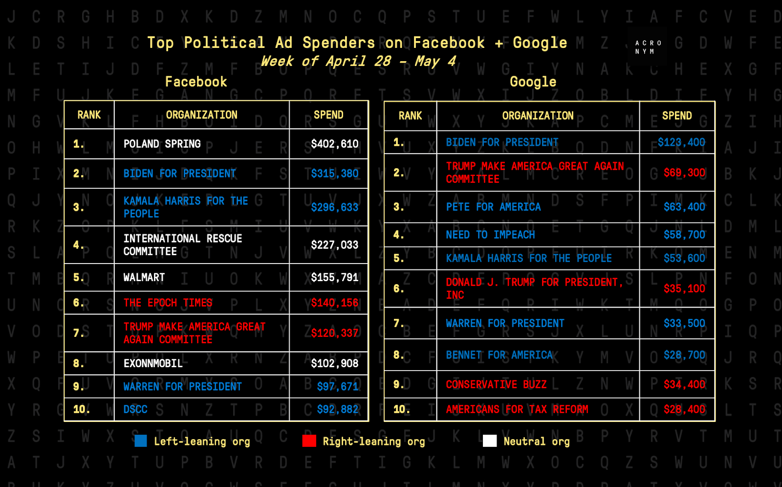 Here are the top Facebook and Google spenders from April 28 – May 4: