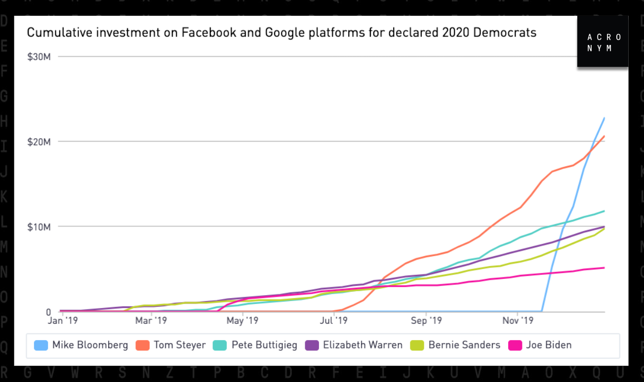 Here’s a look at the cumulative Facebook + Google investment for the top spending Democratic candidates for President: