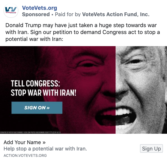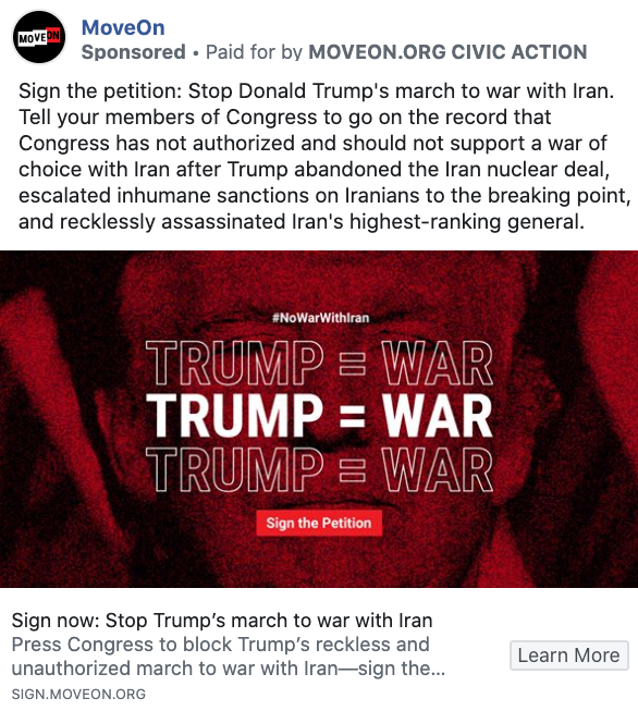 BUT it isn’t just the Trump campaign beginning to advertise on the issue. Progressive movement groups also quickly sprang into action online to advocate against any war with Iran: