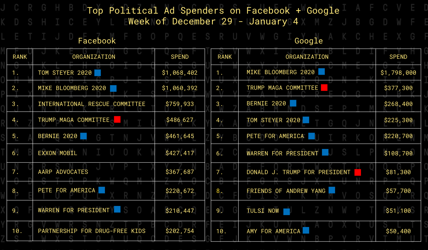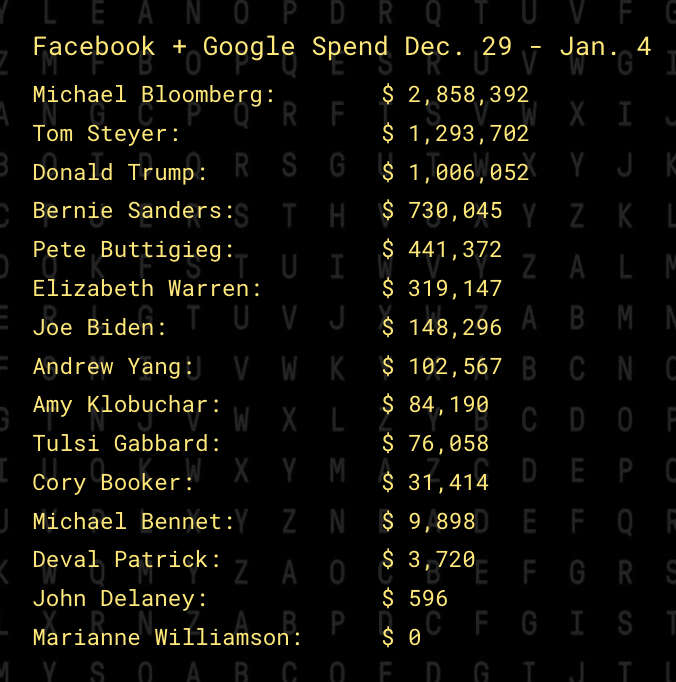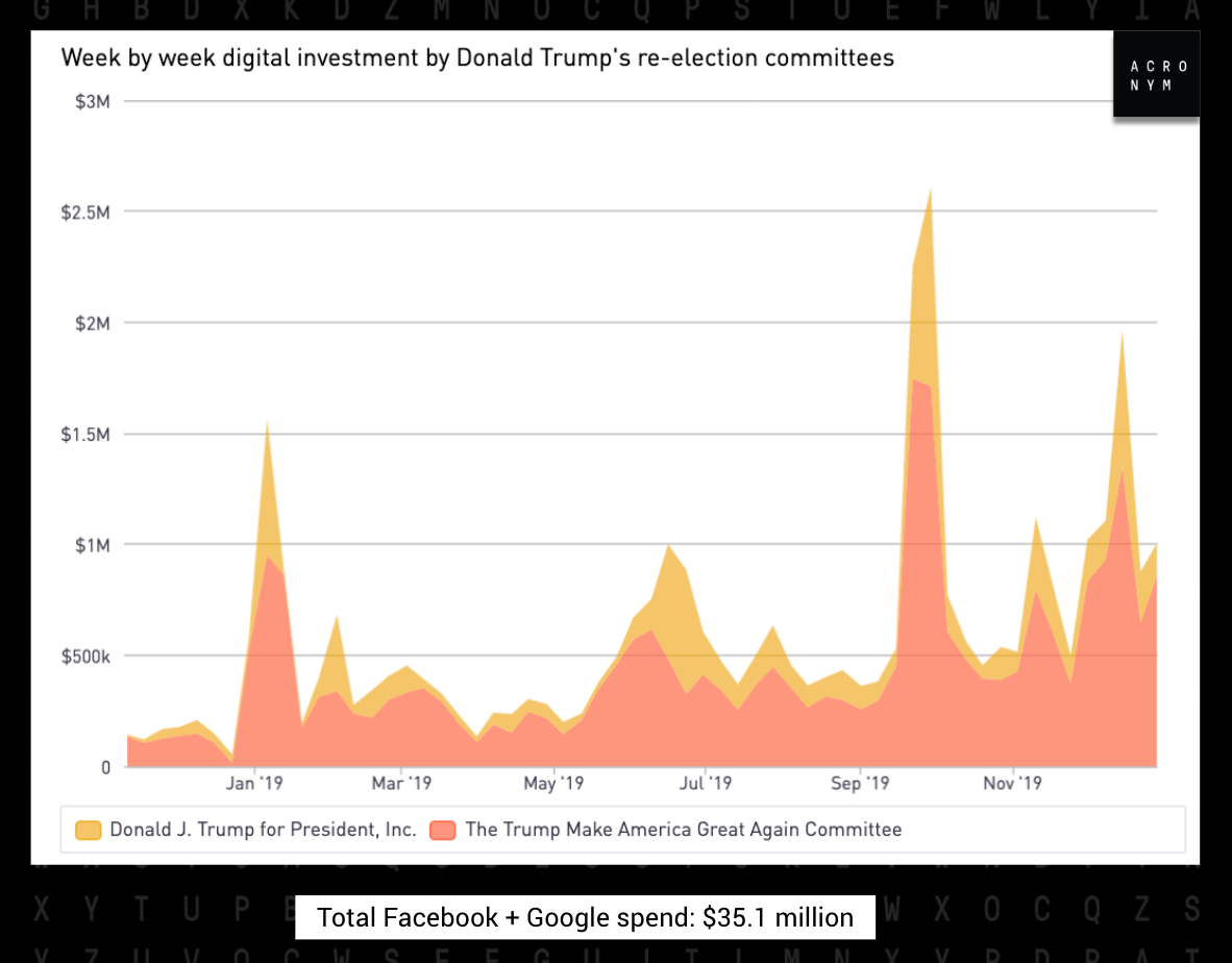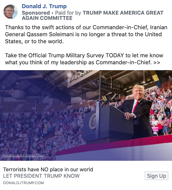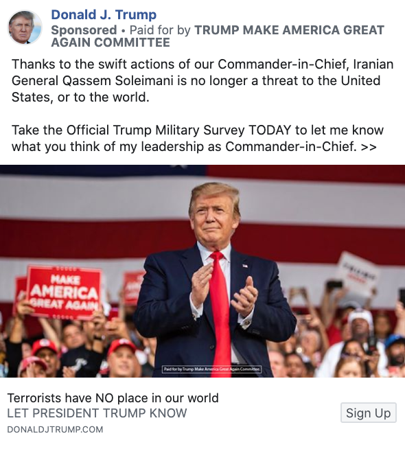 Donald Trump’s re-election campaign has spent over $35 million on Facebook + Google since the 2018 midterm elections. On Monday, his campaign launched a wave of acquisition ads thanking himself for the military strike that killed an Iranian general. More on that below.
