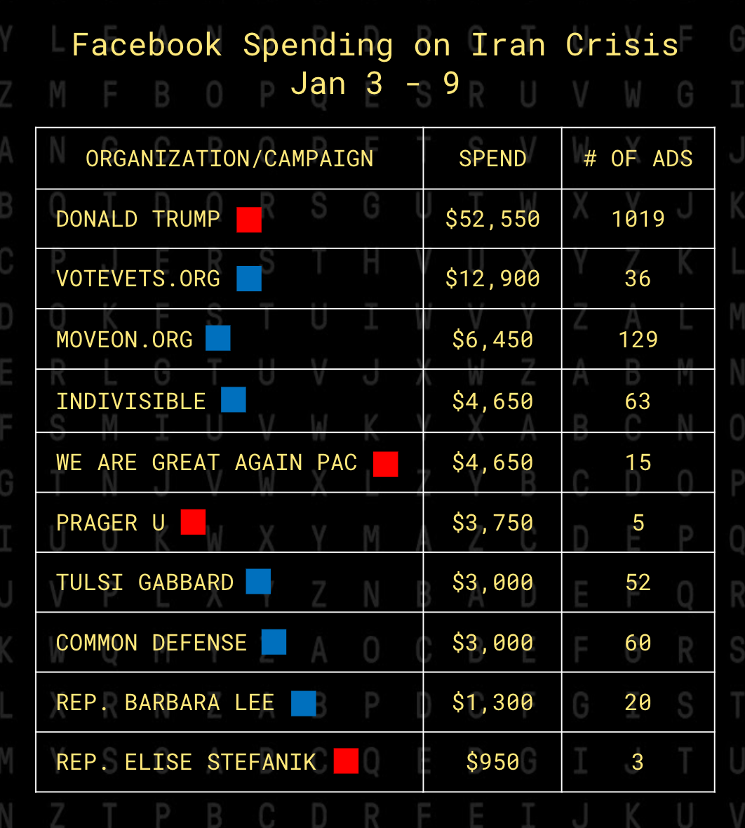 FWIW, here’s how much groups on both sides of the issues have spent on Facebook ads around the Iran crisis since January 3rd. [Note: These numbers will continue to increase as many ads are still active]