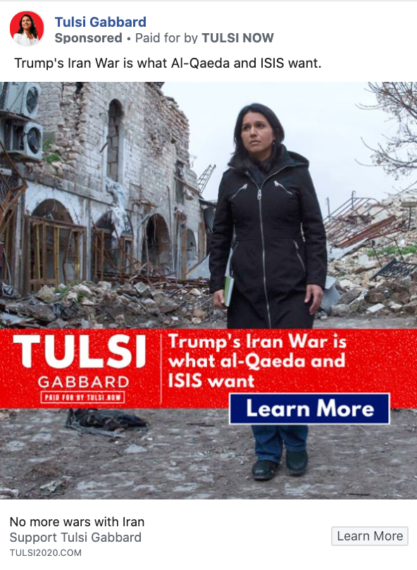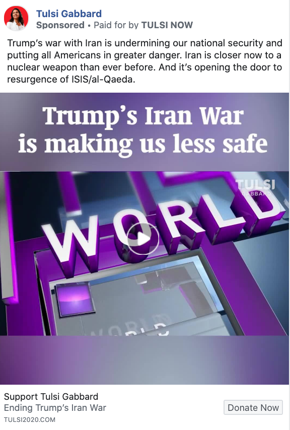 It’s notable that Tulsi Gabbard is the only Democratic presidential candidate to advertise on Facebook with ads mentioning “Iran” or “Soleimani” in the past week. Maybe it’s not surprising though, as a big part of her schtick has always been “ending regime change wars” in the Middle East.