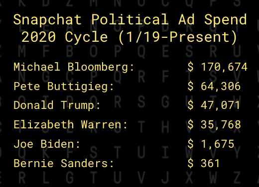 In other news, we’ve started digging deeper into the political Snapchat ads archive , and we’ll continue to share spending numbers as the election heats up. Typically, campaigns and organizations don’t have to spend hundreds of thousands of dollars on the platform to reach their intended audiences - but we noticed that Michael Bloomberg’s campaign did so anyway. He became the top spending candidate on Snapchat in just the last two weeks of 2019.