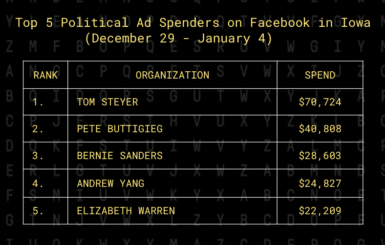 With less than a month to go before the caucuses, these are the top 5 spenders on Facebook in Iowa over the past 7 days .