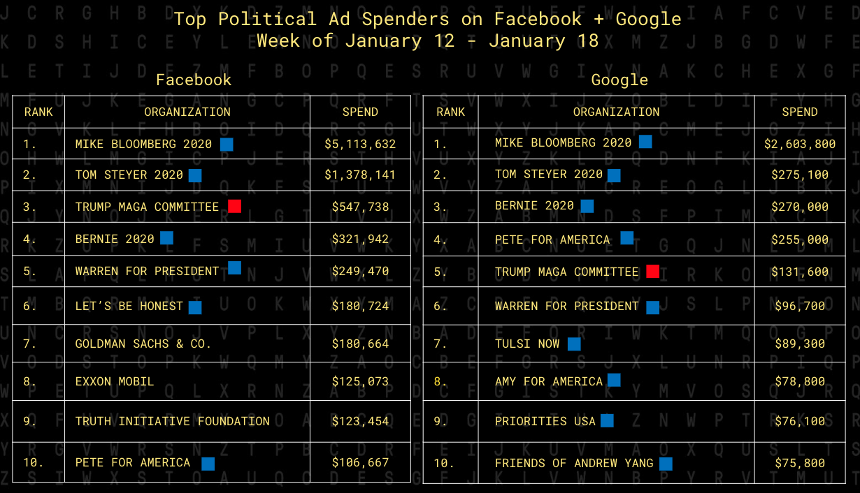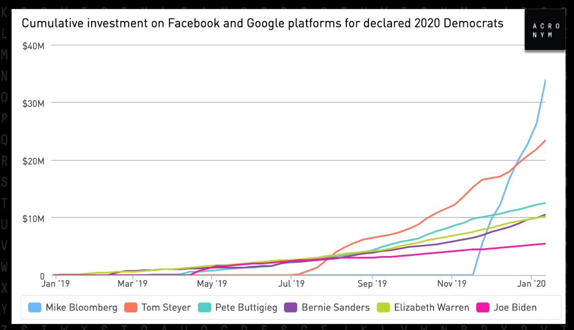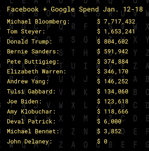 On the Democratic side, Michael Bloomberg spent more on Facebook + Google last week than any campaign has ever spent in a seven-day period.