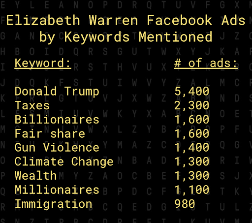 Since launch, the Warren campaign has consistently been a top-tier spender on Facebook and Google advertising, totaling over $10 million spent since launching her campaign. That’s twice as much as the Biden campaign, and about the same as the Sanders team.