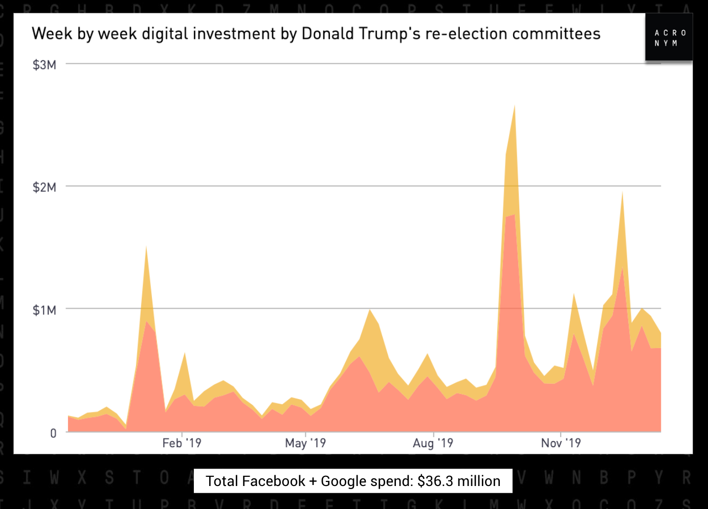 Donald Trump’s re-election campaign has spent over $36.3 million on Facebook + Google since the 2018 midterm elections. His campaign unveiled plans for a new organizing app in development this week, despite potential opponents like Joe Biden, Elizabeth Warren and Bernie Sanders already having their own supporter engagement tech in place for months.