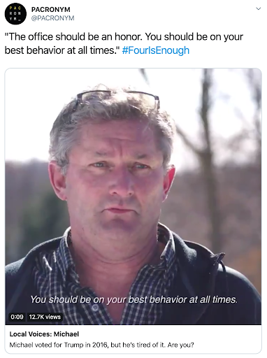 Shameless plug alert: As part of its #FourIsEnough digital advertising campaign, our affiliated political action committee PACRONYM has launched a new set of videos highlighting local voices of Americans exhausted by the President’s chaotic behavior. Give em’ a watch + a RT below: