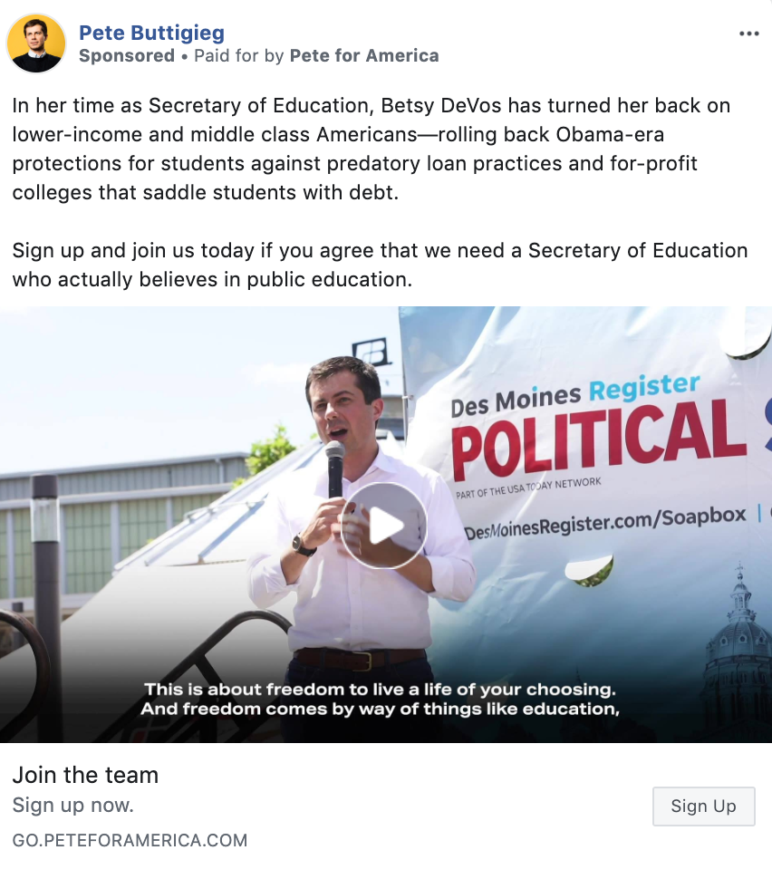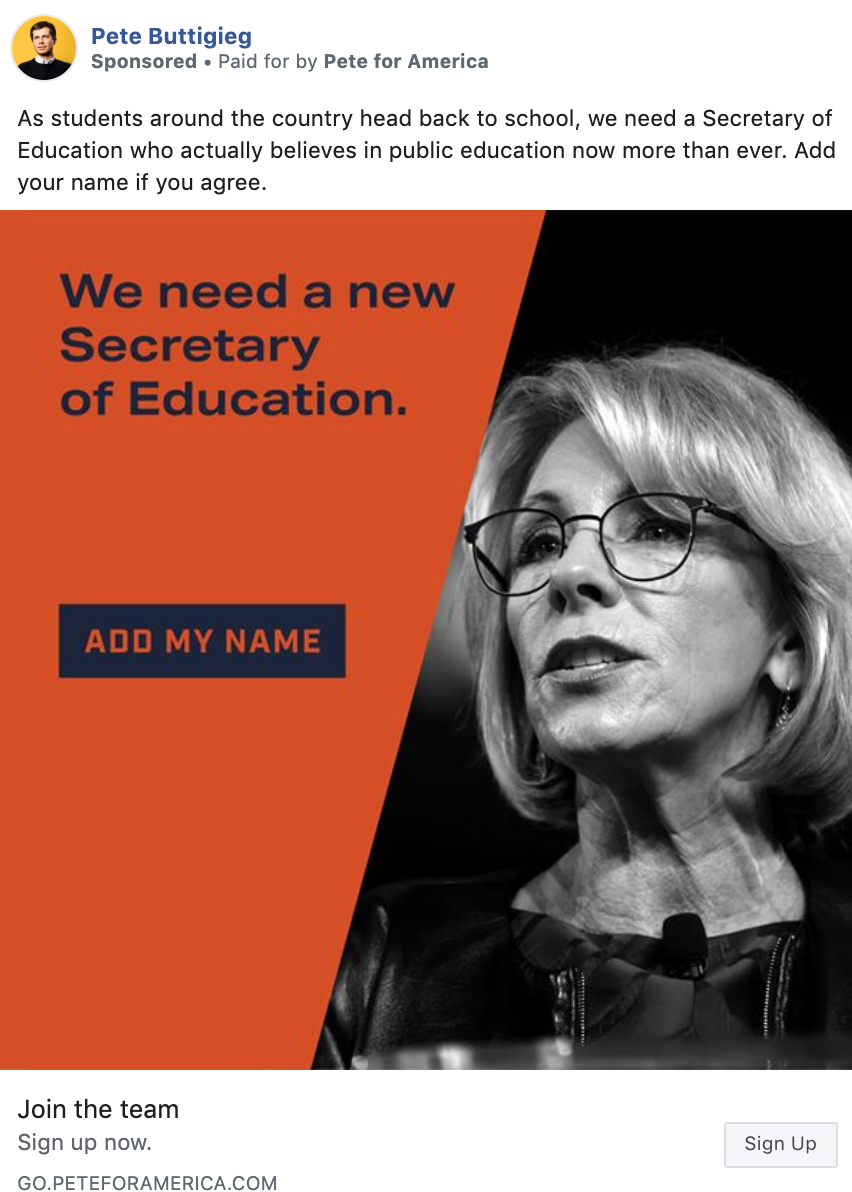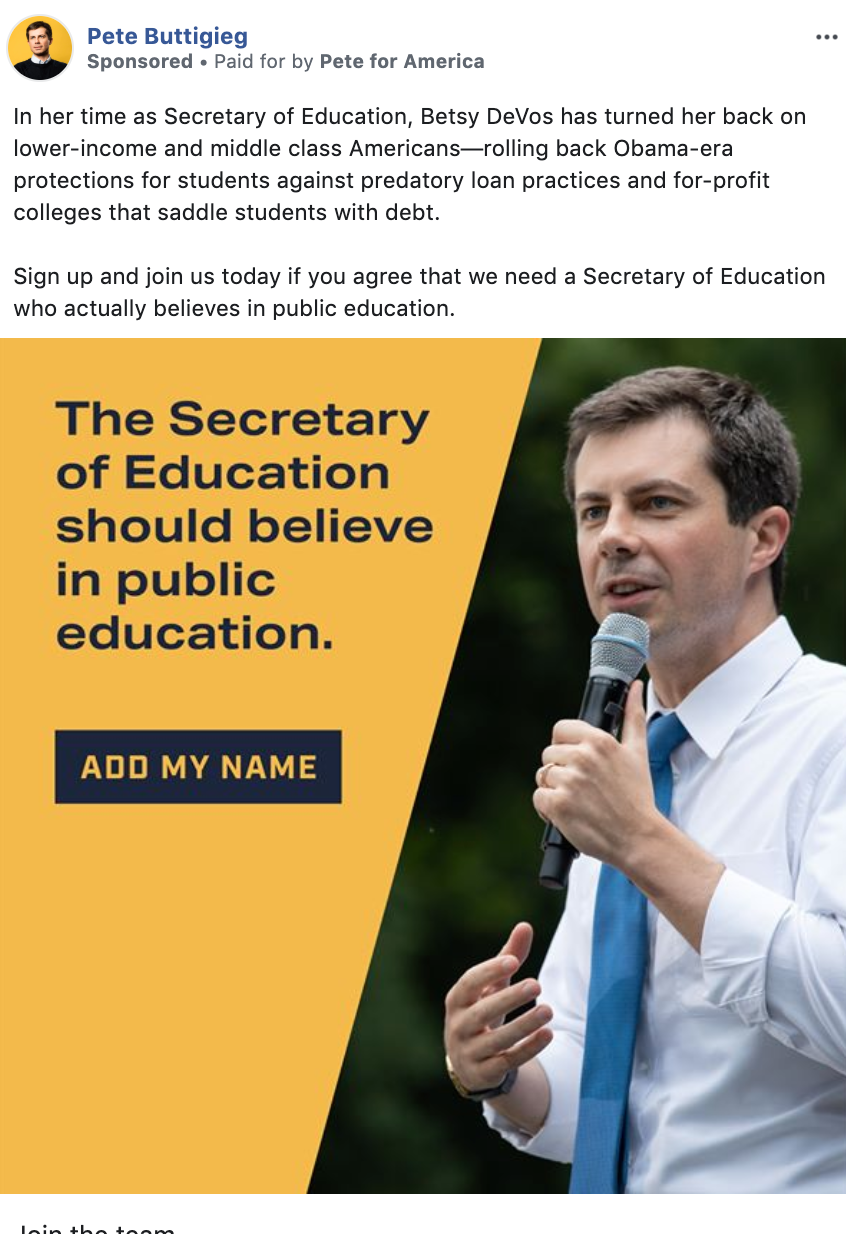 The Buttigieg campaign outspent all others on the platform, continuing to slam Ed Sec. Betsy Devos with an education-focused ad campaign targeting supporters nationally and in early states like New Hampshire: