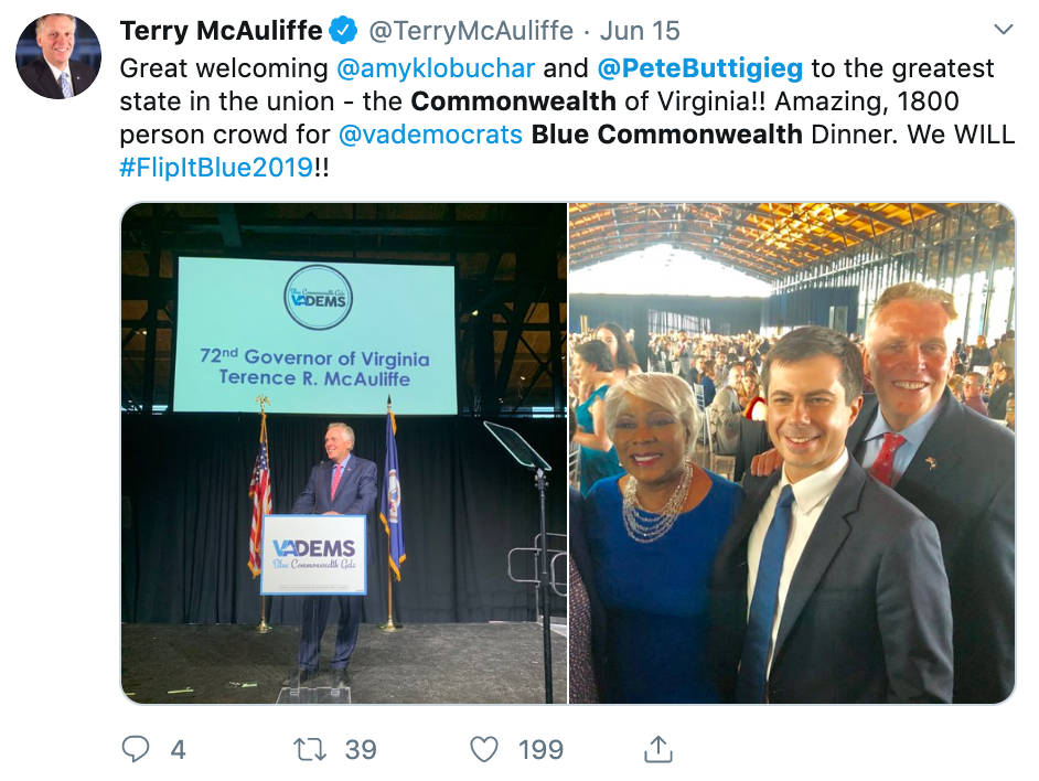 Virginia’s also a key presidential primary state that, along with delegate-rich states like California, will vote for their choice for the Democratic nominee on Super Tuesday. And we’ve noticed some of the 2020 Democratic campaigns have been using their stature to shine a light on down-ballot Democrats in Virginia, which feels like a win-win to us. More on their contributions to the field below.