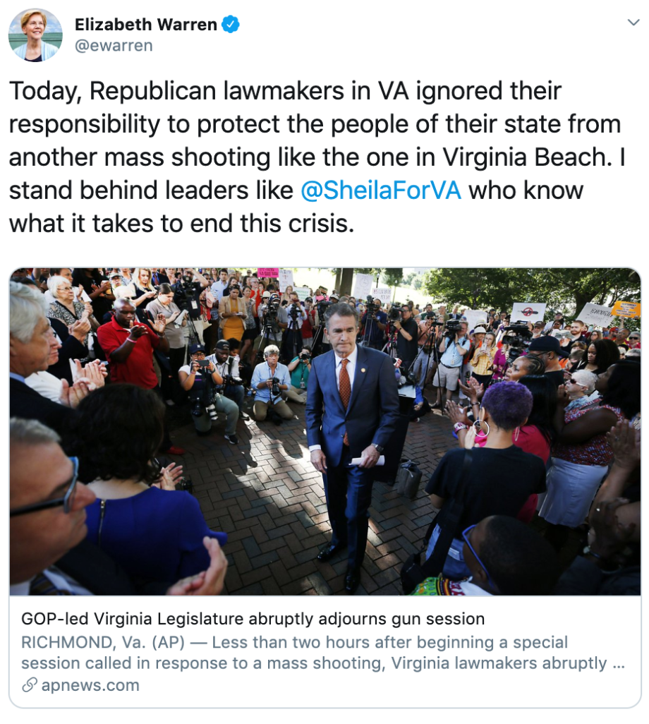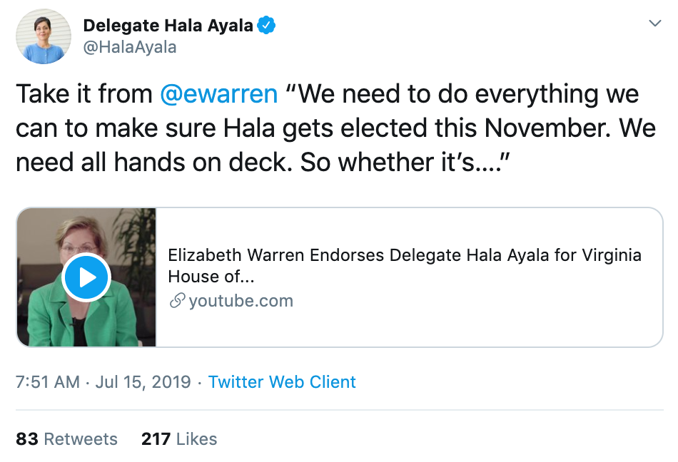 Elizabeth Warren made her first Virginia campaign stop in the state in May, and has paid close attention to this year’s elections there. She’s used her position to call out the Republican-majority legislature for stonewalling gun safety legislation, and endorse local candidates in must-win districts like Sheila Bynum Coleman and Hala Ayala.