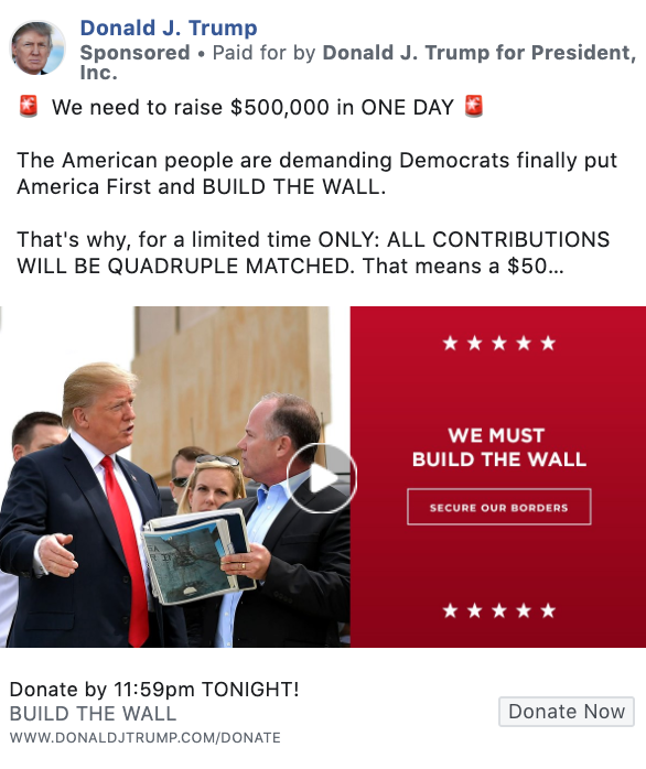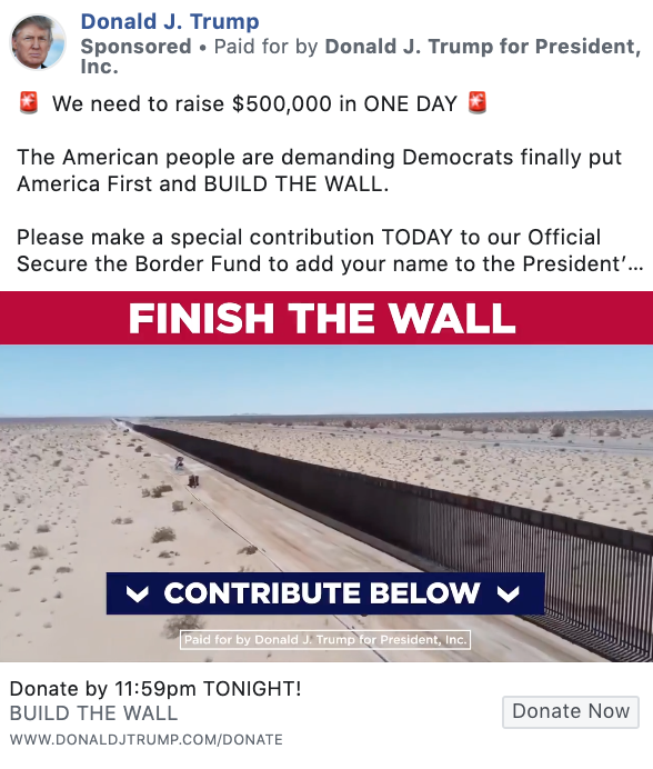 Donald Trump’s campaign has spent over $17 million on Facebook + Google advertising since the mid-terms. Most of his ads last week were pretty straightforward fundraising ads, including these, which give supporters the impression that their contributions actually go towards “building the wall.” I guess the U.S. Treasury should be on the lookout for a check from the Trump campaign. 🙄