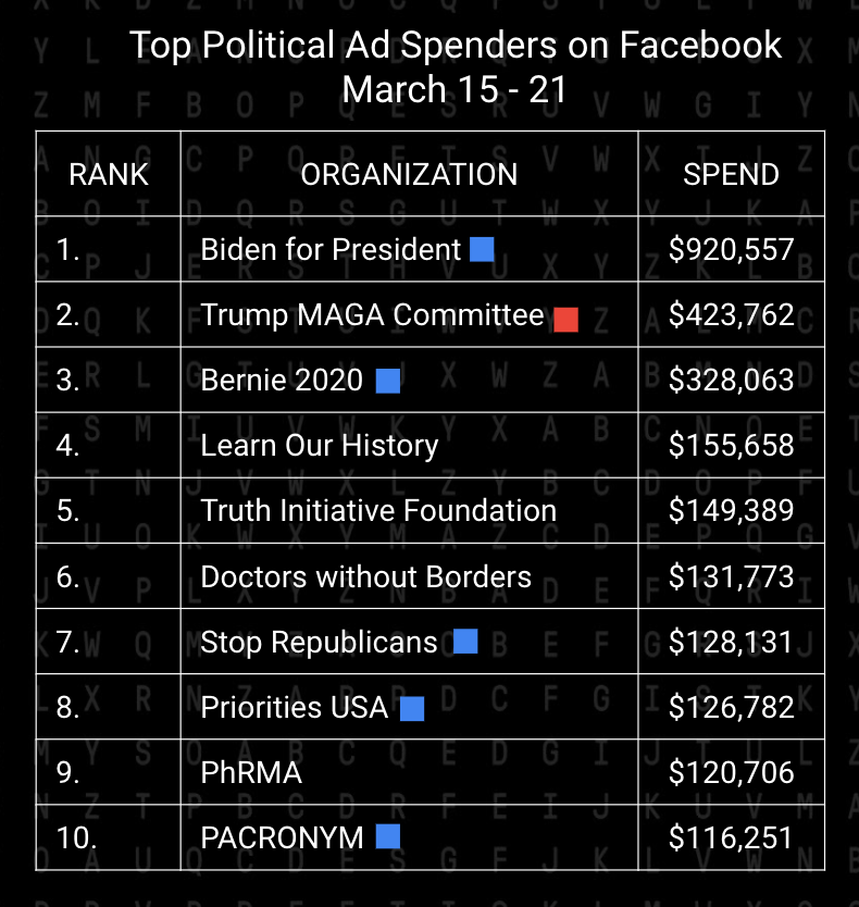 Note: while Bernie Sanders’ campaign spent money on advertising during this period, his ads ended around March 18th and have yet to go back online.