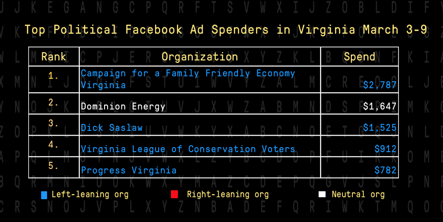 Here is a list of top Virginia political spenders on Facebook the week of March 3-9.
