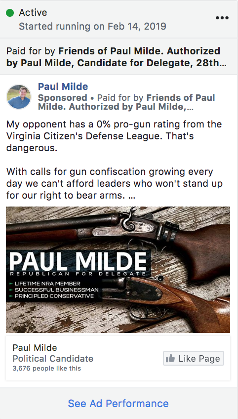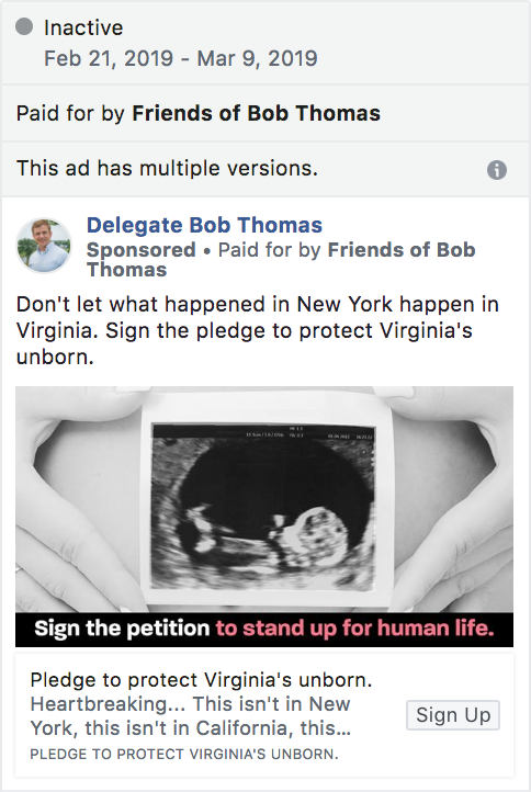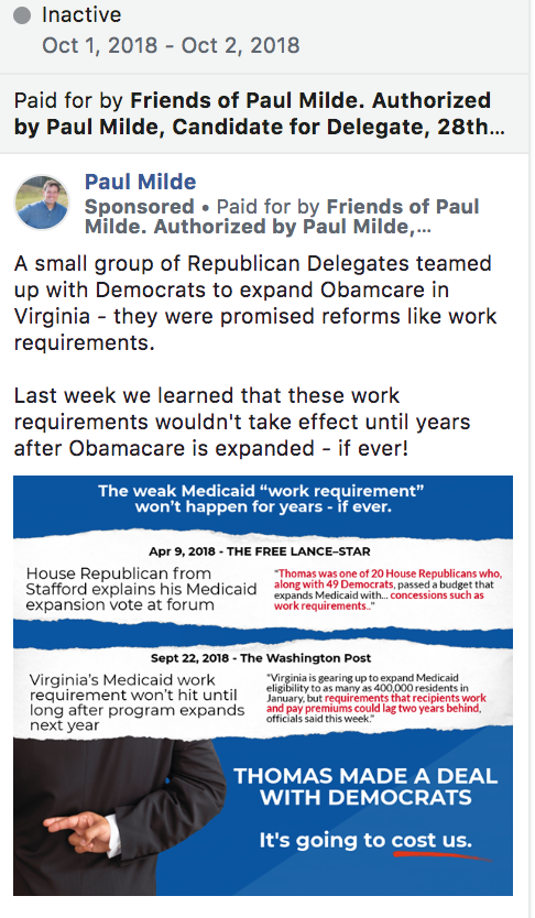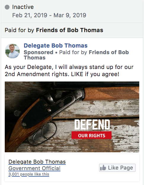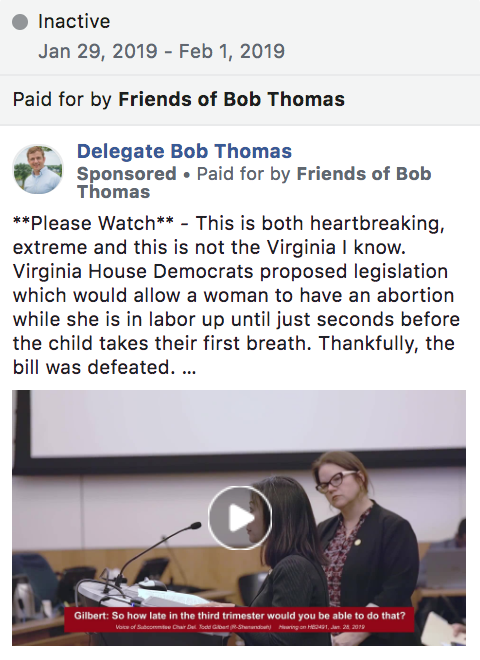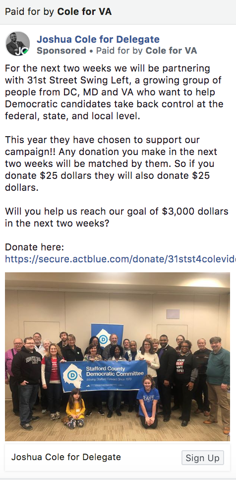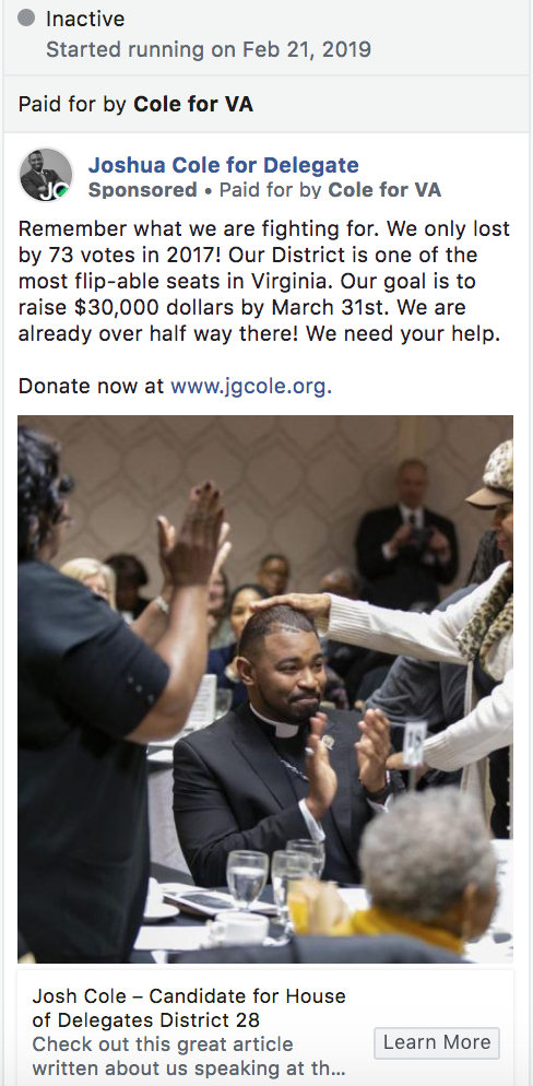 Thomas’s district is a toss-up too. He was first elected to the General Assembly by a margin of only 82 votes in 2017, and Senator Tim Kaine won 54.9% of the vote there in 2018. His former opponent Josh Cole is running unopposed for the Democratic nomination. Cole has only invested $180 in Facebook advertising so far, but, since he doesn’t have primary opponent, he’s been able to dedicate each one of his ads to fundraising for the general election.