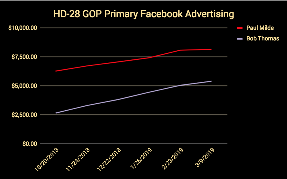 According to the last filing on Dec. 31, 2018, Thomas has $26,787 on hand compared to Milde’s $12,900. Regardless of who wins the primary, their war chests already look significantly drained compared to the other House incumbents in competitive districts. On the other hand, Cole only had $10,091 cash on hand as of December, but he’s been fundraising more aggressively now that the midterms are over –– we counted four fundraising events on his Facebook page since January.