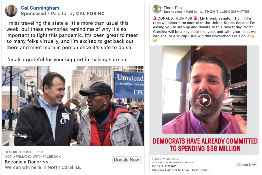 Thom Tillis, meanwhile, has finally put out his first Facebook ads of the month, few as they may be. There are two sets: one uses anti-China rhetoric and imagery to list-build, while the other follows in the footsteps of Steve Daines and uses Don Jr. to fundraise.