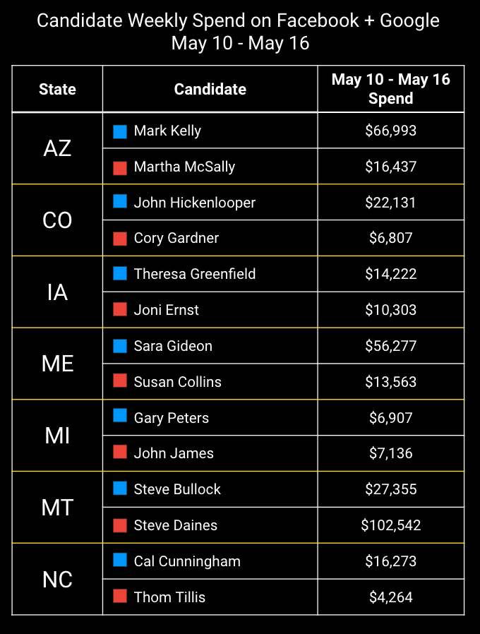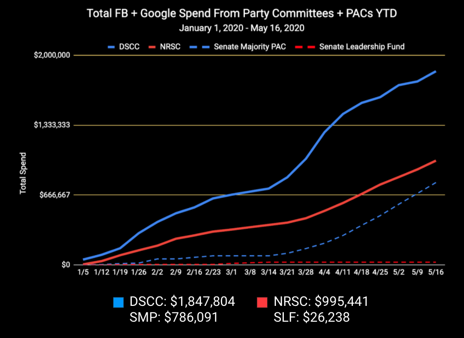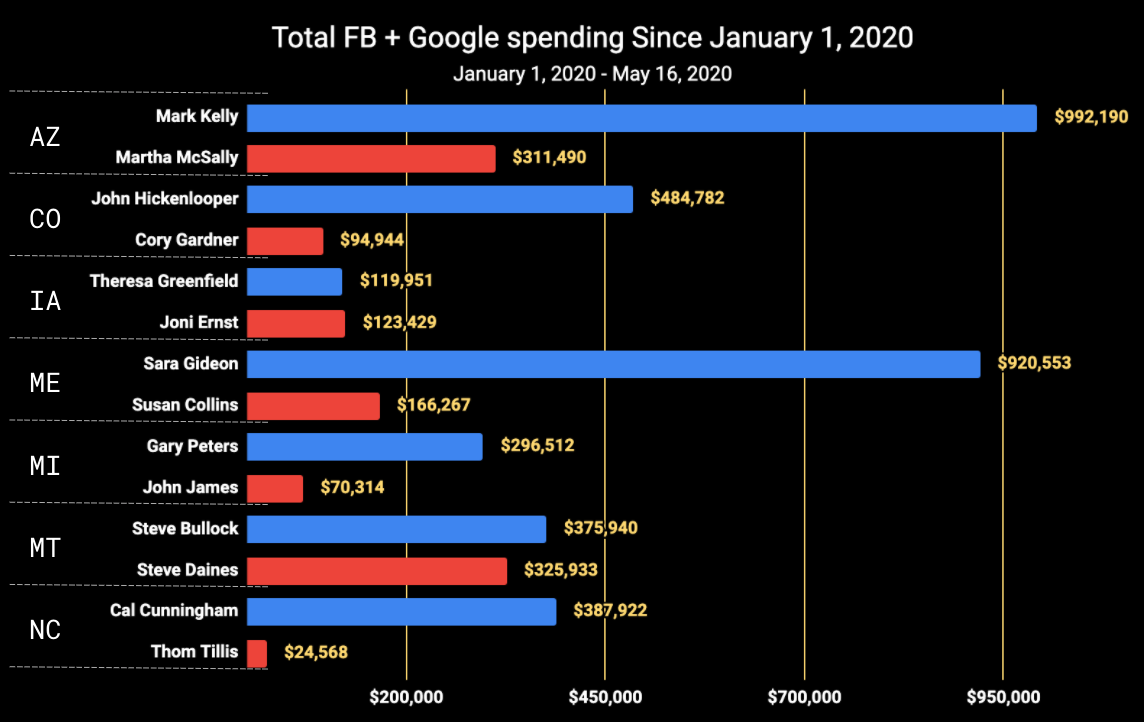 It’s looking increasingly likely that Mark Kelly’s campaign is going to be the first Senate campaign in a competitive state to spend more than $1 million on Facebook + Google ads in 2020. It also looks like Theresa Greenfield’s digital ads operation is starting to pick up a little bit of steam as well – but more on that below.