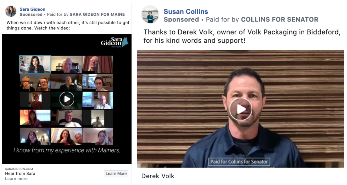 In Maine, both the Sara Gideon and the Susan Collins campaigns are both trying new ways to feature their supporters’ voices in their recent Facebook ads, while both are still primarily sticking to search ads on Google. On the Democratic side, the Gideon campaign has turned some of their virtual town halls into video + static ads.