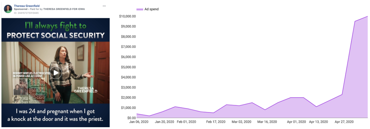 This week, Theresa Greenfield’s campaign put out its first TV ad of the year. When some campaigns do this, they might put it up on YouTube and call it a day – but not the Greenfield campaign. They put it up on YouTube, yes, but they also put more money behind it than they have with any Google ad they’ve run so far this year (check out the graph from Google’s ad library below), AND they ran a Facebook-native version of the ad on the platform.