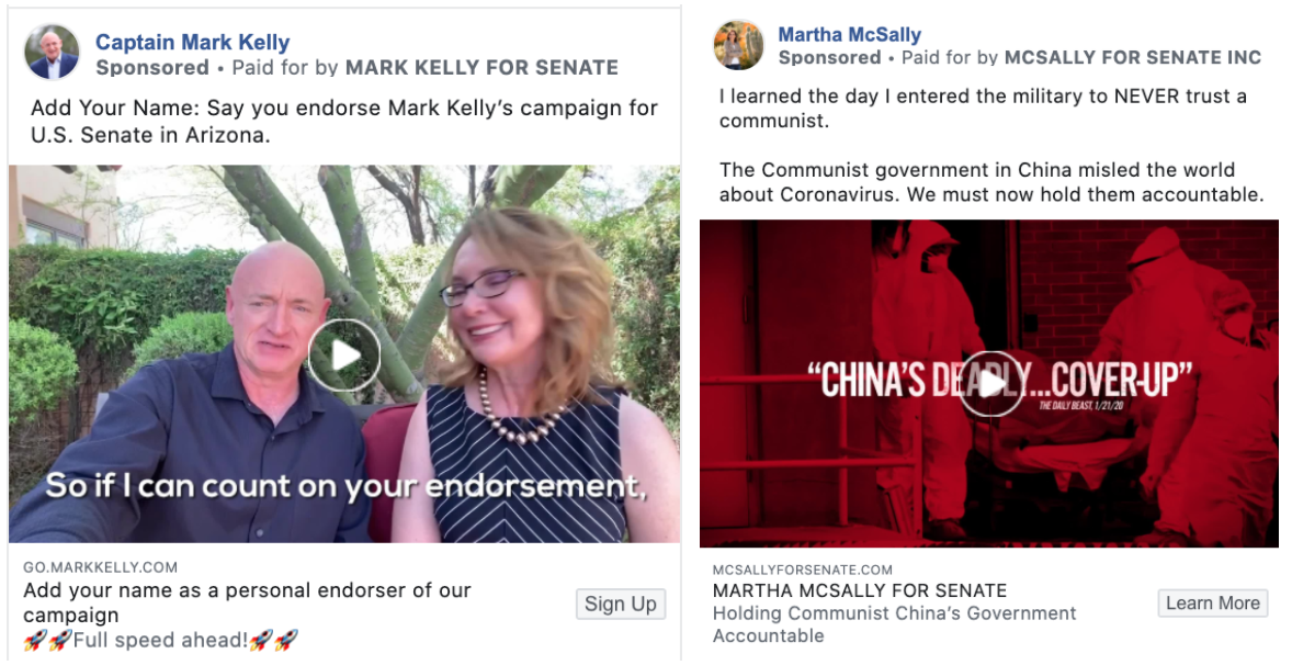In Arizona, Mark Kelly’s campaign seems to be one of the most nimble when it comes to adjusting their tactics to use what works. Remember that lovely video of Kelly and Gabby Giffords that performed well on social? They must have realized how well it performed and then filmed a similar version, which they’re now testing as a list building ad on Facebook. They’re not running the ad on Google or YouTube, though – their most recent YouTube ad is a 15-second biographical spot.