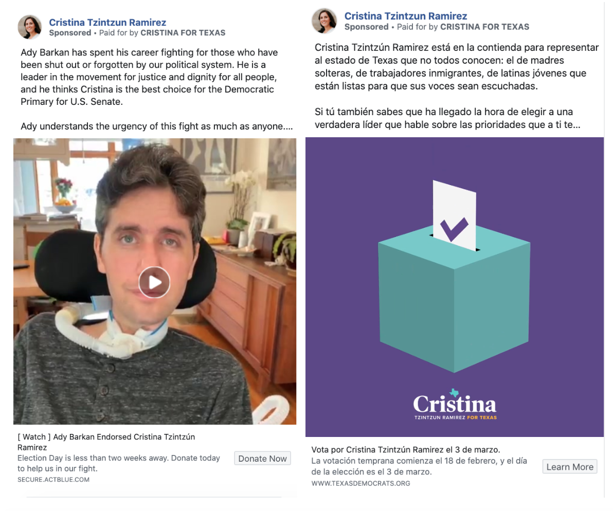 Tzintzún Ramirez, the Justice Democrats’ candidate of choice, has earned the endorsements of AOC, Rep. Joaquin Castro, and activist Ady Barkan – and she wants to make sure Texans know it. Some of her most recent Facebook ads are looking to fundraise off of these endorsements, and include a straight-to-camera video from Barkan. She’s also been running Spanish voter education ads, one of the only campaigns we’ve seen that’s done so in this race (surprisingly).