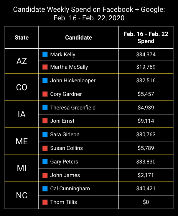 Sara Gideon continues to blow everyone out of the water in terms of digital spending by reaching almost $500,000 spent so far this year. It also looks like Gary Peters has nearly doubled his digital spending from last week, but Republicans across the board have yet to accelerate their digital investment.