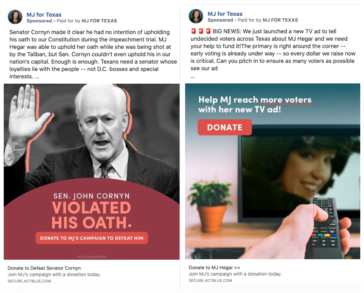 MJ Hegar, despite her relatively low digital ad spend, seems to have a wide variety of ads on Facebook. In the final days of the campaign, her campaign has been fundraising off of two things: John Cornyn, and…her newest TV ad. Her ads were otherwise list building ads focused on health care and John Cornyn’s record on gun control and impeachment.