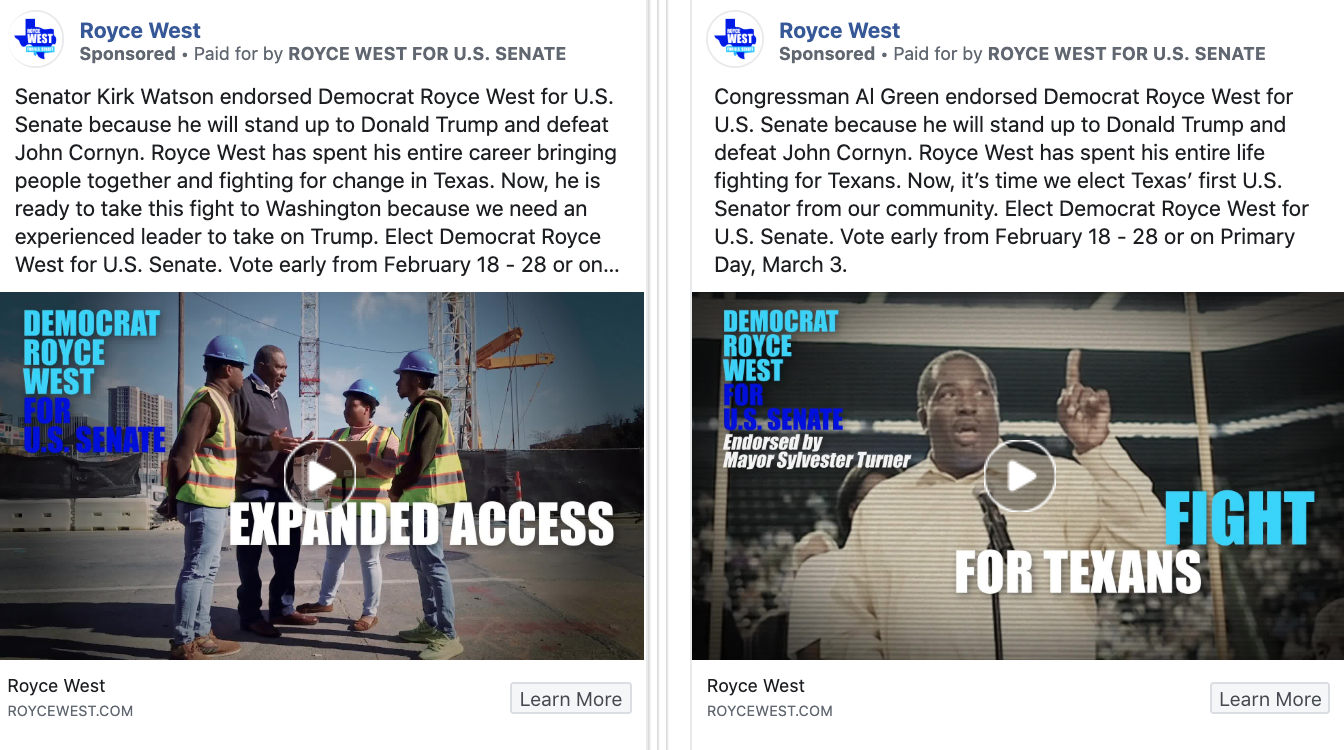 Finally, State Sen. Royce West has mostly been running acquisition ads promoting his endorsements from a fellow state senator and Rep. Al Green. He hasn’t been running very many ads, but unlike most political candidates, his campaign is putting decent money behind each ad – anywhere from the typical $100 or less to as much as $8,000 on individual ads. We’re also interested to see how his video-first digital ad strategy pays out on Super Tuesday.