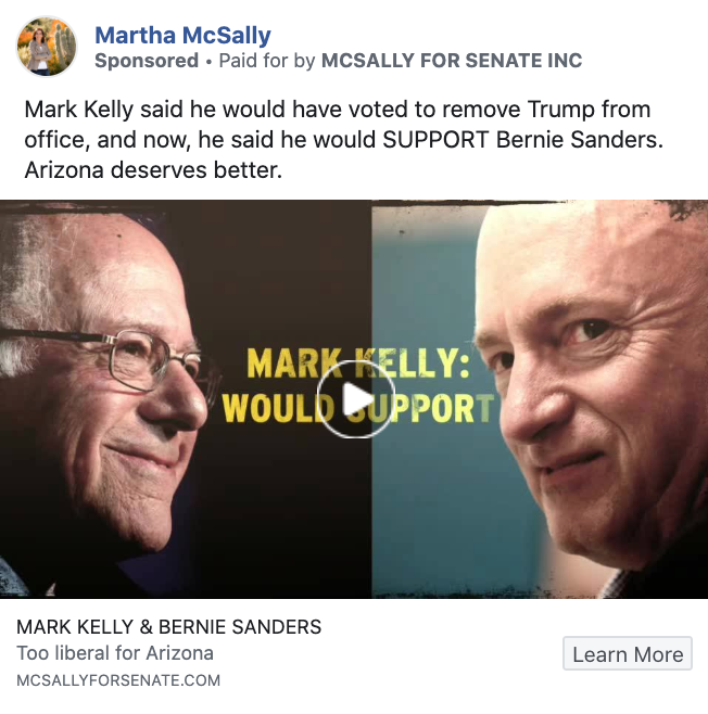 Martha McSally was one of the first to attach her opponent to Sanders in her digital advertising. She attacked Mark Kelly for supporting Trump’s removal from office after his impeachment and for supporting Bernie Sanders. That’s it, that’s the ad. 🙄