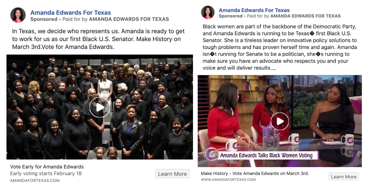Amanda Edwards, a former Houston City Council member who’s explicitly angling herself as the possible first black senator from Texas, has shied away from digital advertising in recent weeks. However, her most recent ads highlighted her engagement with and connections to Texas’ black community.