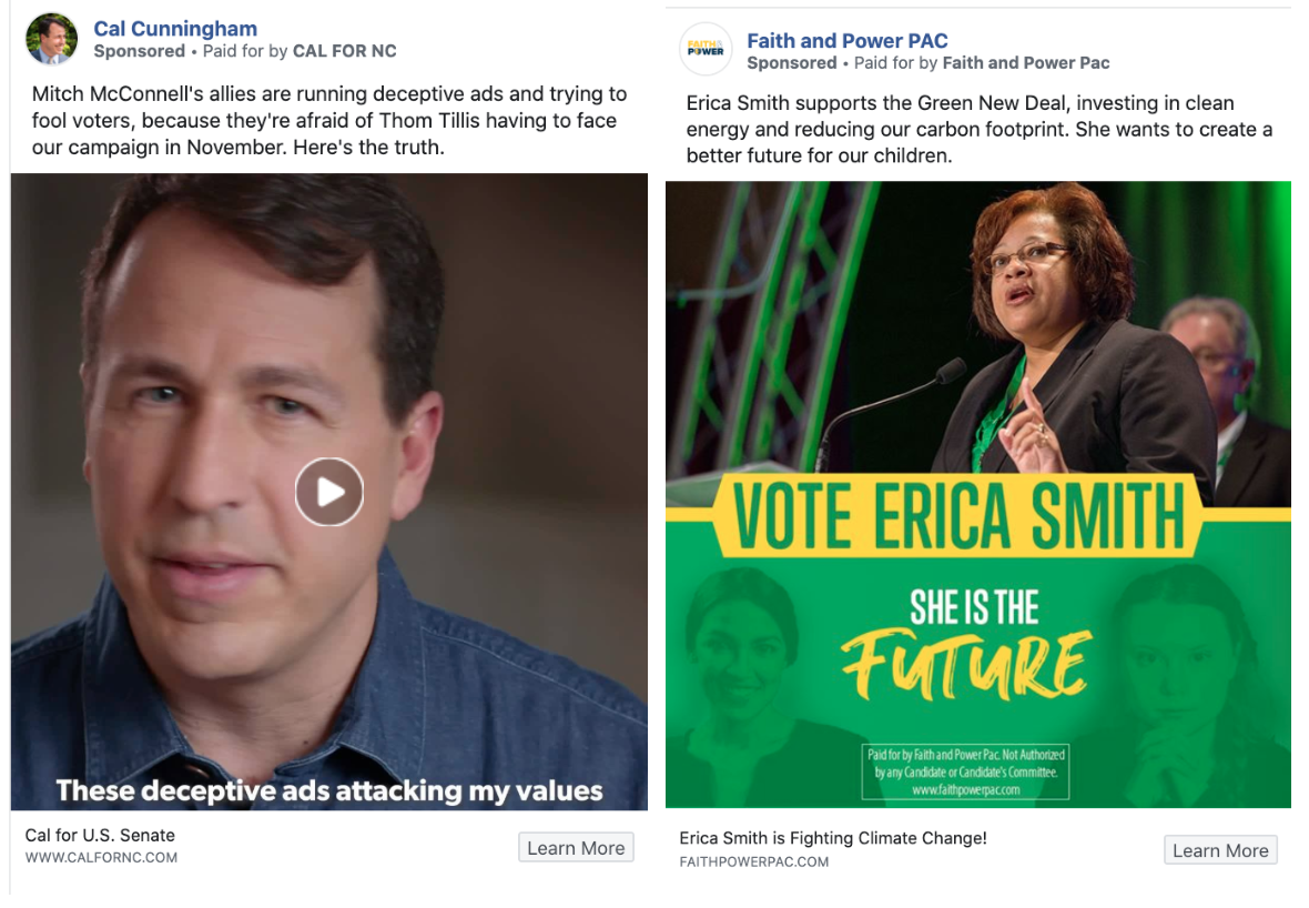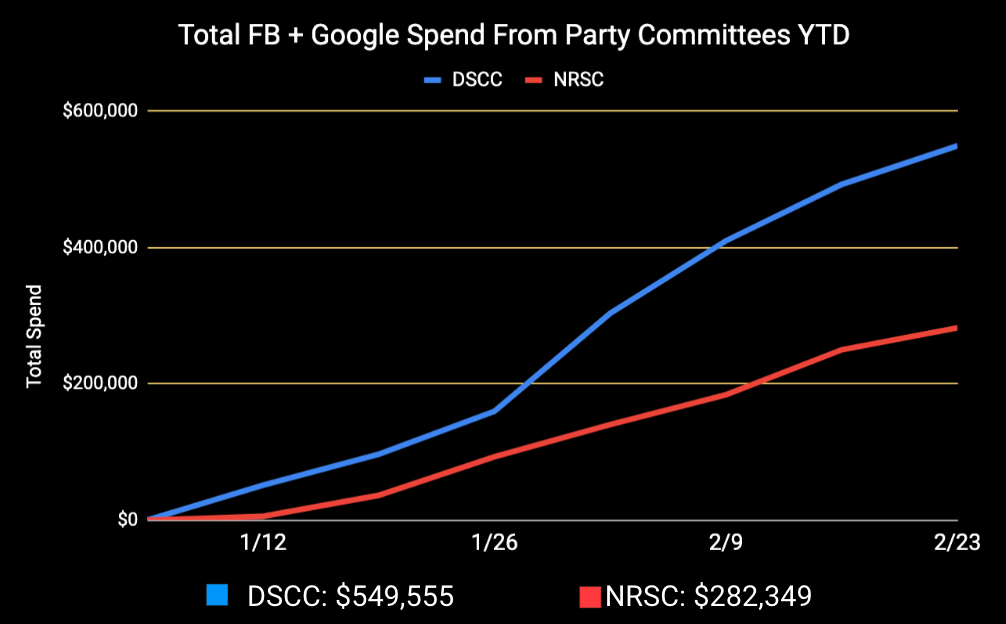 Smith, however, has not spent any money on Facebook or Google for this race. However, we learned earlier this month that a new Republican PAC, Faith and Power, started running digital ads on Smith’s behalf. We know now though that Faith and Power PAC is being entirely funded by the Senate Leadership Fund, the PAC closely aligned with Mitch McConnell.