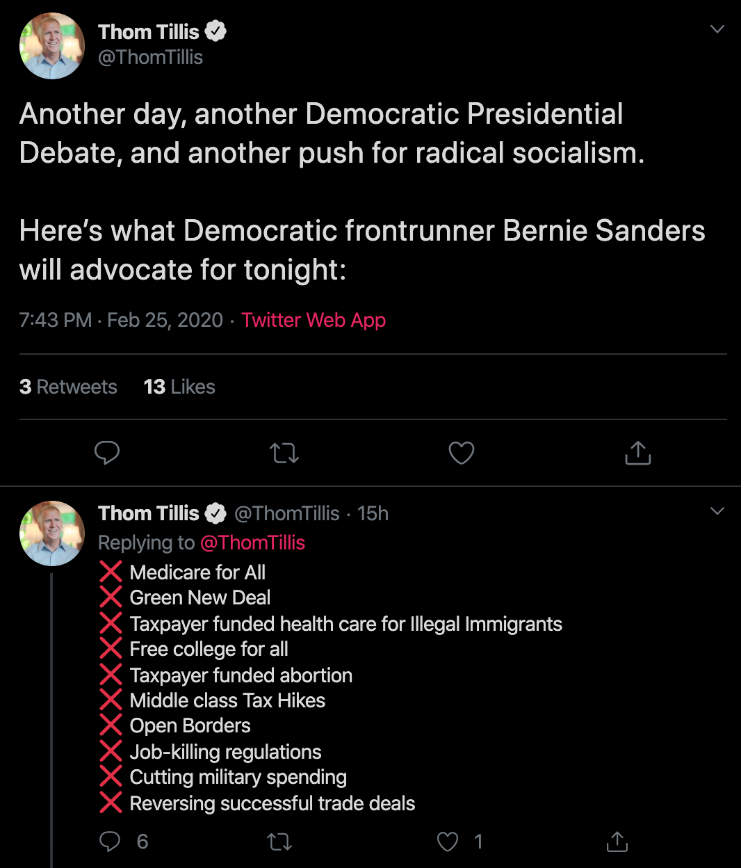 Thom Tillis did a whole thread about Sanders before Tuesday’s Democratic debate. Just FYI, his thread only got a handful of retweets, so we doubt this message reached very many of his constituents. Better luck next time, Thom.