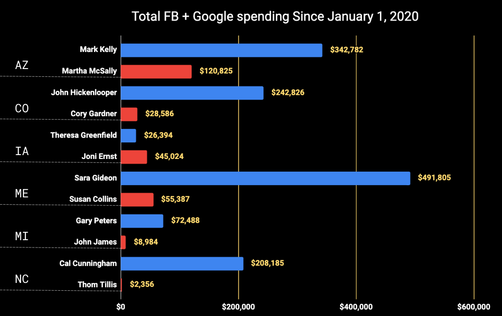 Here’s how much each candidate in six competitive Senate races spent on Google + Facebook last week: