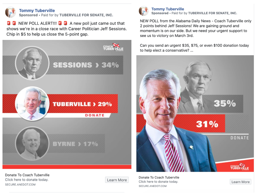 This dynamic has changed in the three-man race between Jeff Sessions, Rep. Bradley Byrne, and former coach Tommy Tuberville. Roy Moore is still there, but he’s polling at 5 percent and he’s spent less than $1,000 on digital ads so far this year, so hopefully this is the last time we’ll have to mention the alleged pedophile in this newsletter. 🏻♂️