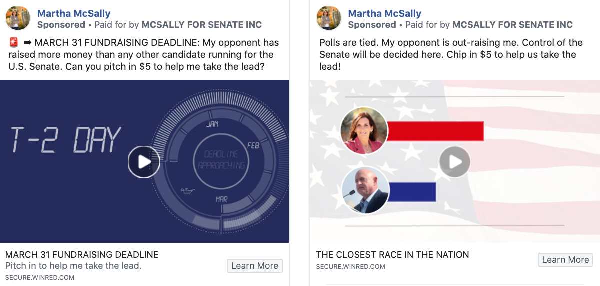 Martha McSally, on the other hand, hasn’t yet run a single ad on Facebook or Google so far this month, seemingly holding true to her word that she would suspend campaign activities for the first two weeks of April. While she did spend nearly $15,000 on Facebook + Google ads this past week, all of that seems to have been spent in the final days of March. These ads primarily recognize that Kelly currently has both a fundraising and a polling advantage.