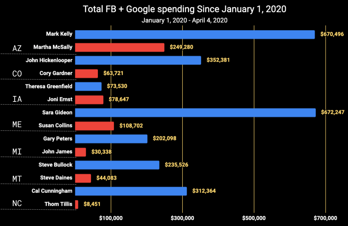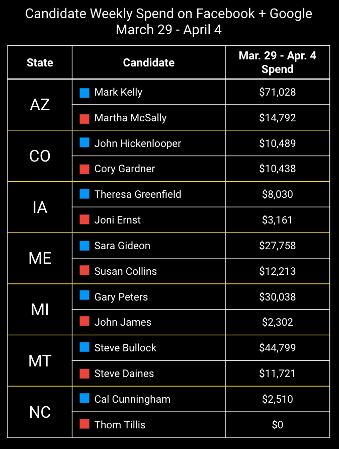 Most candidates, however, seem to have paused (or in some cases, have yet to ramp up to begin with) their digital spending. Of the 14 campaigns whose spending we track, only four – Mark Kelly, Sara Gideon, Gary Peters, and Steve Bullock – spent more than $20,000 on Facebook + Google ads last week.
