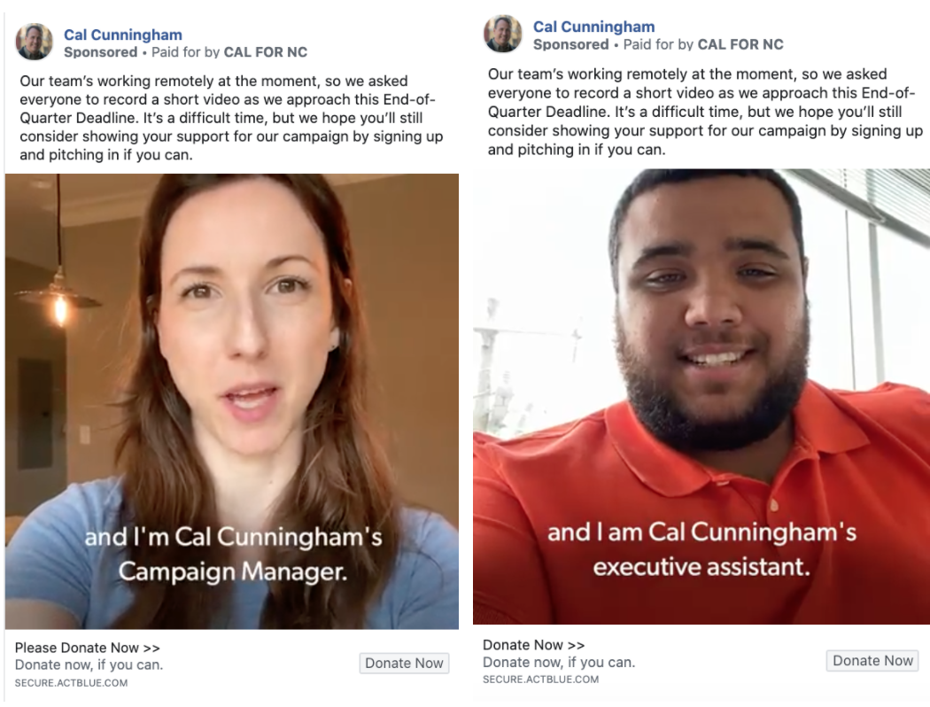 Their most recent ads featured a different way to mobilize their team while social distancing – they featured different staff members making straight-to-camera fundraising appeals. Thom Tillis, on the other hand, has really only been running Google Search ads recently, and his campaign still hasn’t run a single ad on Facebook since JANUARY.