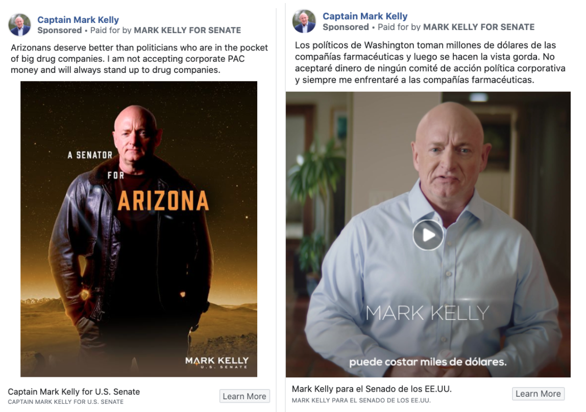 Starting in Arizona, Mark Kelly’s campaign hasn’t let the pandemic slow down their paid digital juggernaut. Their digital fundraising and list-building ads continue to focus on their biggest issues: health care and campaign finance reform. Most recently, their ads have been video-first (and bilingual) or posturing Kelly as this superhero-esque figure. 🦸♂️