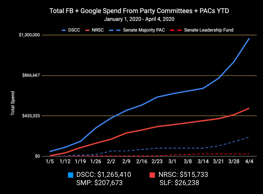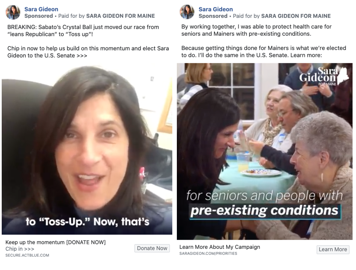 Moving up north to Maine, Sara Gideon’s campaign may not be running their digital ad onslaught for the time being, but they’re still consistently outspending Susan Collins’ campaign every week. Most recently, Gideon’s campaign used messages about healthcare, bipartisanship, and Larry Sabato changing the race to Toss-Up to try and get some small-dollar donations, including a straight-to-camera video from the candidate herself. 🤳Susan Collins, meanwhile, is still only running a couple of coronavirus-related ads on Facebook and basic Google Search ads.