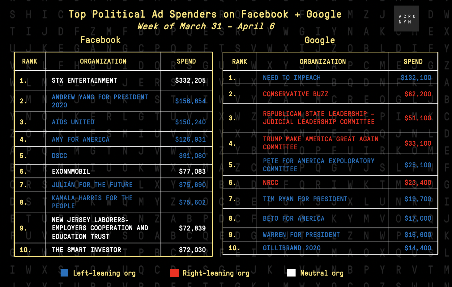 Here are the top Facebook and Google spenders from March 31 - April 6. Unsurprisingly, Democrats dominate the Facebook top spenders list as they likely were making a final push on March 31st to fundraise before the end of quarter deadline.